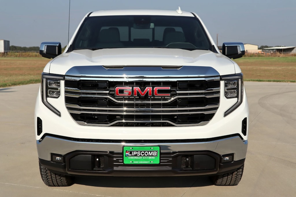Summit White 2026 GMC Sierra 1500 SLT 4WD 10-Speed Automatic EcoTec3 5.3L V8 10-Speed Automatic, 4WD, Dark Walnut/Slate Leather.