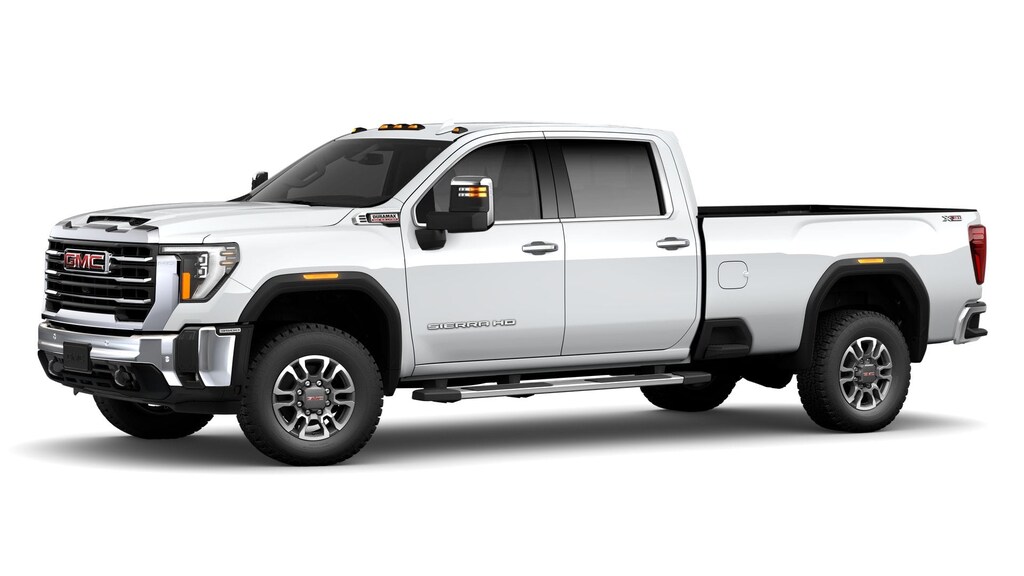 Summit White 2026 GMC Sierra 3500HD SLT 4WD 10-Speed Automatic Duramax 6.6L V8 Turbodiesel 10-Speed Automatic, 4WD, Dark Walnut/Slate Leather.